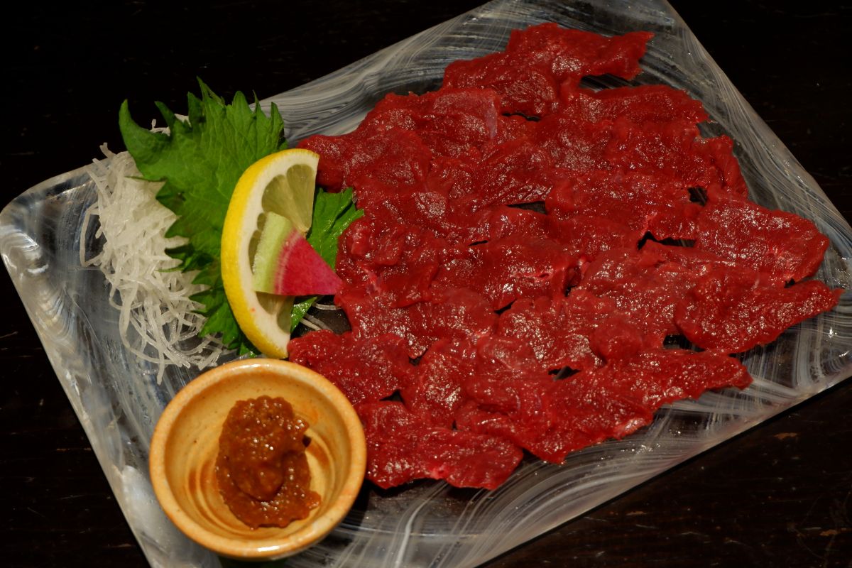 阿賀町の食材を使った郷土料理が味わえる「奥阿賀の郷 山姥」は、隠れ家的な落ち着いた和の空間が魅力の店。個室の名前には“つがわ”をはじめ阿賀町の地名が付けられ、まるで阿賀の里山に招かれたような温かみのある雰囲気が漂います。看板の馬刺しは、阿賀町の肉屋から取り寄せる会津産の新鮮な馬肉を使用。やわらかな食感と上品な甘みが口いっぱいに広がり、醤油にニンニク味噌を溶いたパンチのある特製だれとの相性も抜群です。希少な馬レバ刺は驚くほど臭みがなく、ごま油の塩ダレとショウガを添えていただくとその甘みとコクが際立ちます。阿賀の恵みと馬肉料理をゆったり楽しめるお店です。