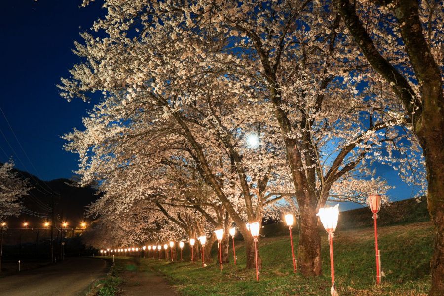 高瀬温泉の薬師堂より約600mに渡って桜並木が続く。夜はぼんぼりも点灯しゆっくりと夜桜を眺めることができる。
