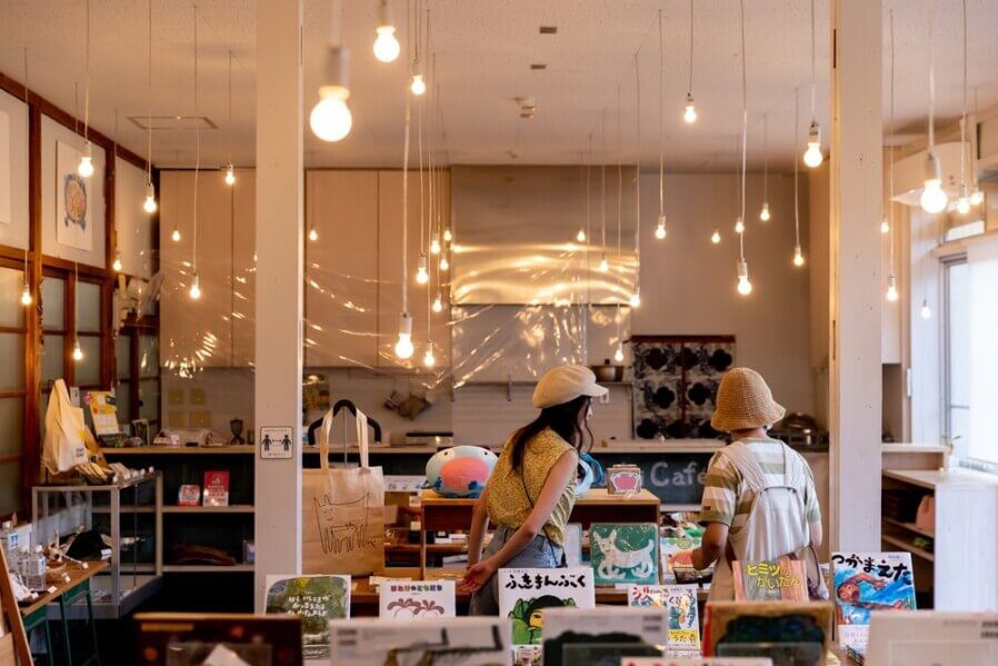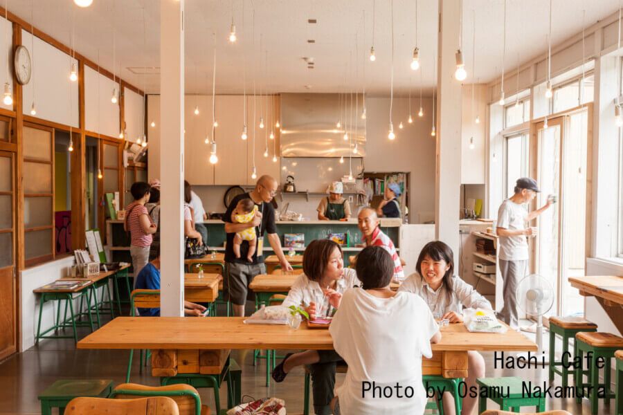 校舎の中にはおもしろい教室がたくさん。Hachi Café、くさむらの部屋、グッズショップもあります。
