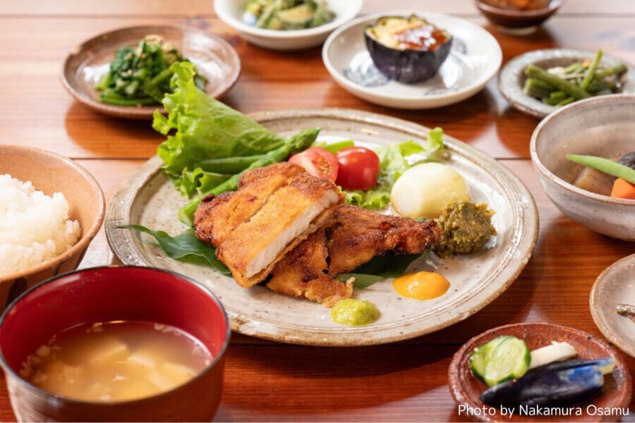 集落の元気なお母さんたちが振る舞うのは、地元で採れた新鮮な食材を使った定食メニュー。築100年を超える茅葺の古民家で、焼き物の器と滋味深い料理、お母さんたちとのおしゃべりをお楽しみください。