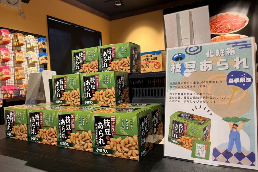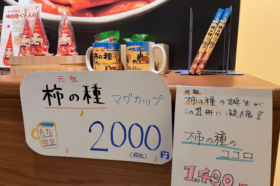 浪花屋製菓で柿の種が生まれた経緯や製造方法を紹介するブースと、直売所も併設しており、定番商品から限定商品と約30種類の商品を販売。