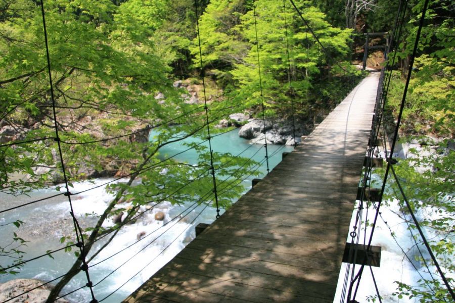 みくらばし見倉橋は、清流・中津川の上に架かる木床の吊り橋です。橋の上に立てば、足元には透明度の高い川の流れ、視線の先には切り立つ岩壁と深い緑の森。人工物でありながら、まるで自然の一部のように溶け込むその姿は、訪れる人に強い印象を残します。