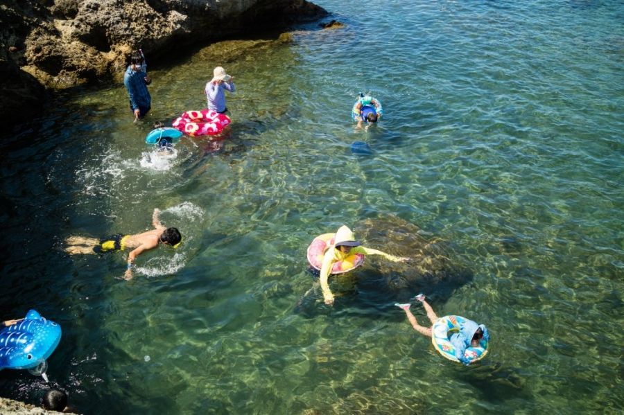 ばんじん・にしばんじんかいすいよくじょう「快水浴場百選」にも選ばれた広い砂浜と浅瀬にある岩場が家族連れに人気のビーチで、岩場にある赤い鳥居が目印。