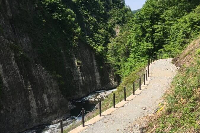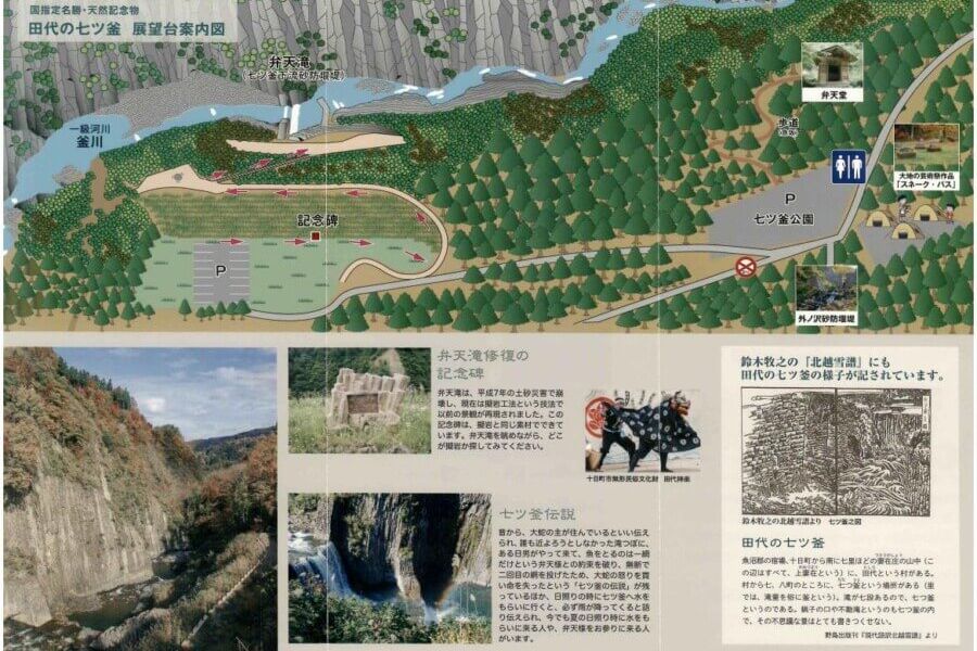 国の名勝・天然記念物に指定されているこの田代の七ツ釜は、苗場山系から流れ出る釜川の渓流に点在する七つの滝つぼで、右岸が断面層、左岸が切り立った縦層という、学術的にも大変珍しい景観です。鈴木牧之の「北越雪譜」や「秋山記行」にも記されています。