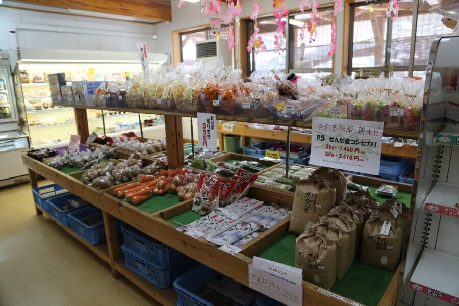 春には「せんだ山菜フェア」、秋には「仙田の収穫祭」など様々なイベントも行われています。また、地元農作物の直売をする「仙田楽楽市場」(水曜定休)には新鮮な野菜が勢ぞろい。豆大福も人気商品です。