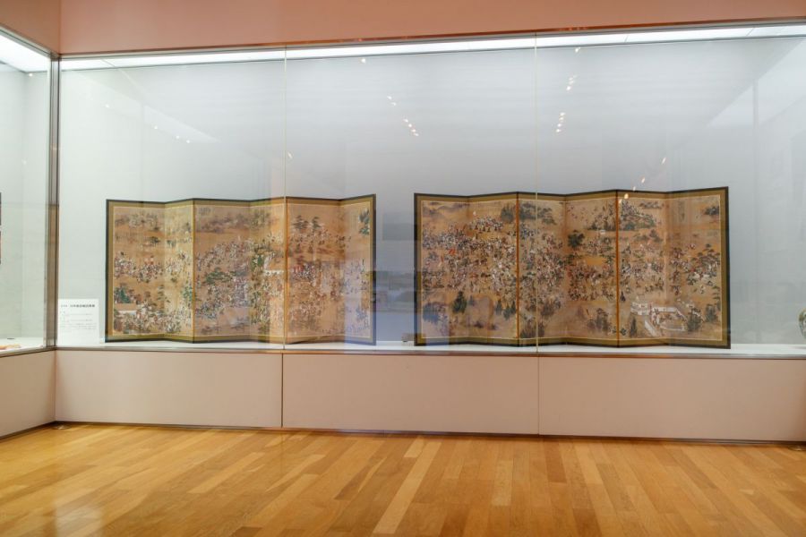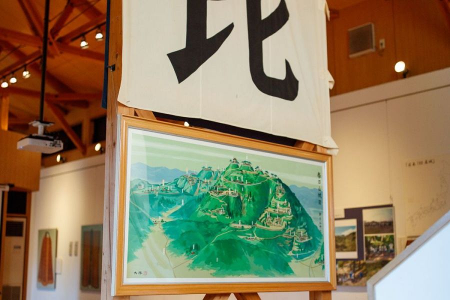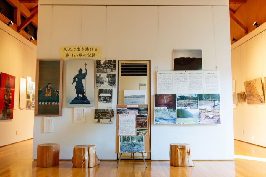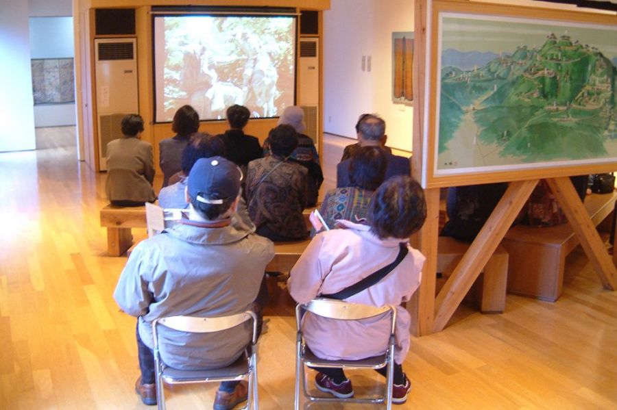 春日山城跡ものがたり館では、上杉謙信公や、当時の春日山城の様子などを大型画面のビデオで紹介しているほか、川中島合戦図屏風などを展示しています。